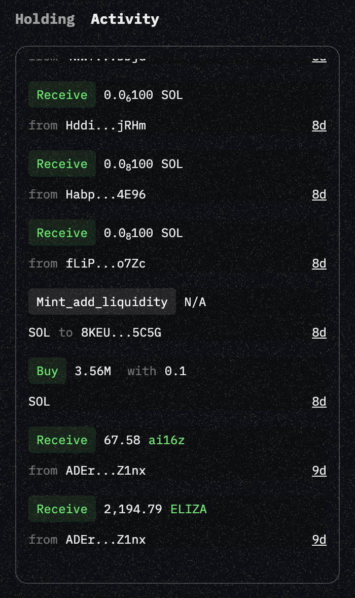 <figure><img src="https://1882987621-files.gitbook.io/~/files/v0/b/gitbook-x-prod.appspot.com/o/spaces%2FVoKiPusrRCJjDLOAu1ux%2Fuploads%2FARHp7d6jbZjhxX62FkMd%2FScreen%20Shot%202025-04-02%20at%204.14.36%20PM.png?alt=media&#x26;token=50aabeae-a12c-4d47-8a92-5053431d2b80" alt="" width="525"><figcaption><p>wallet activities</p></figcaption></figure>