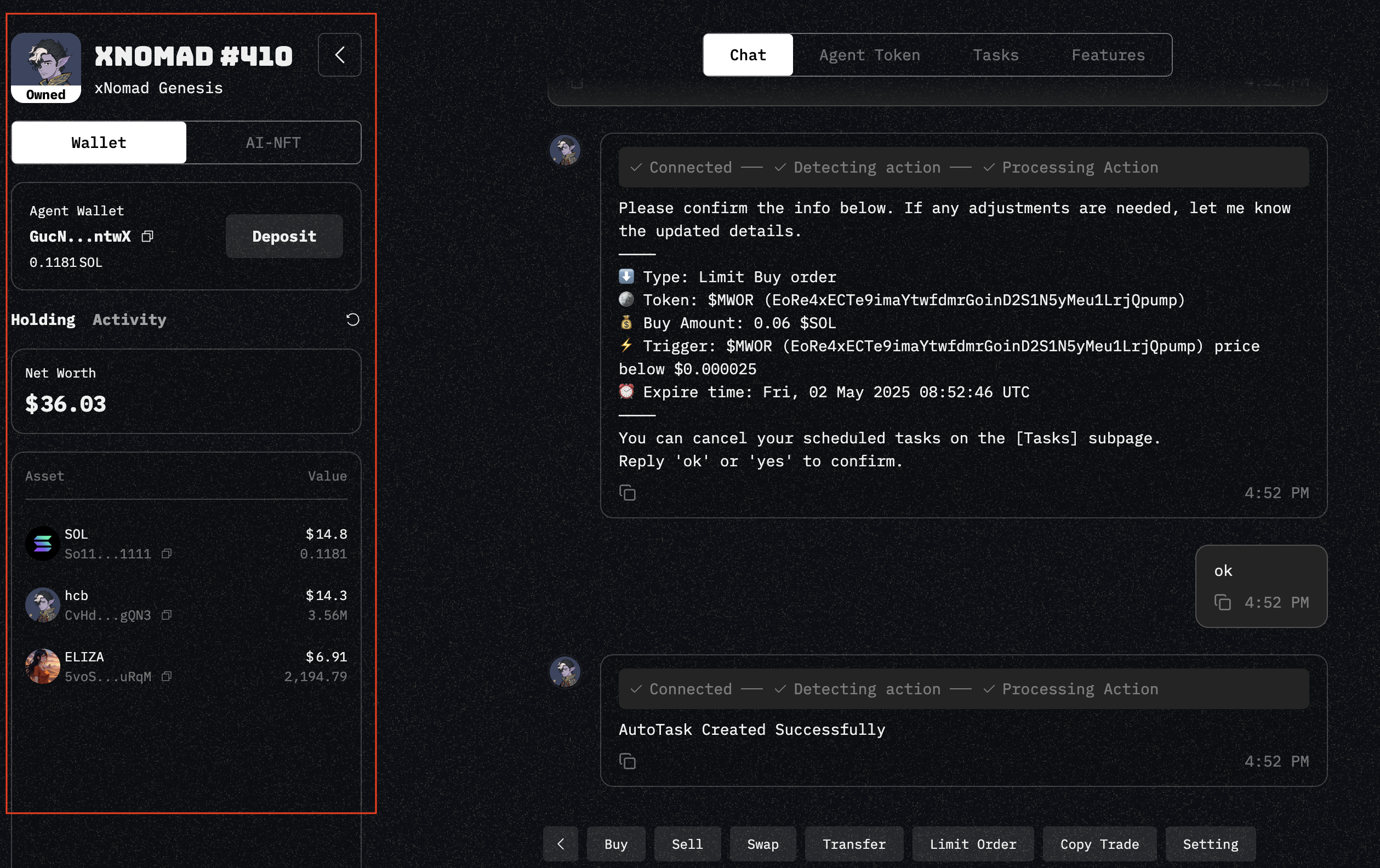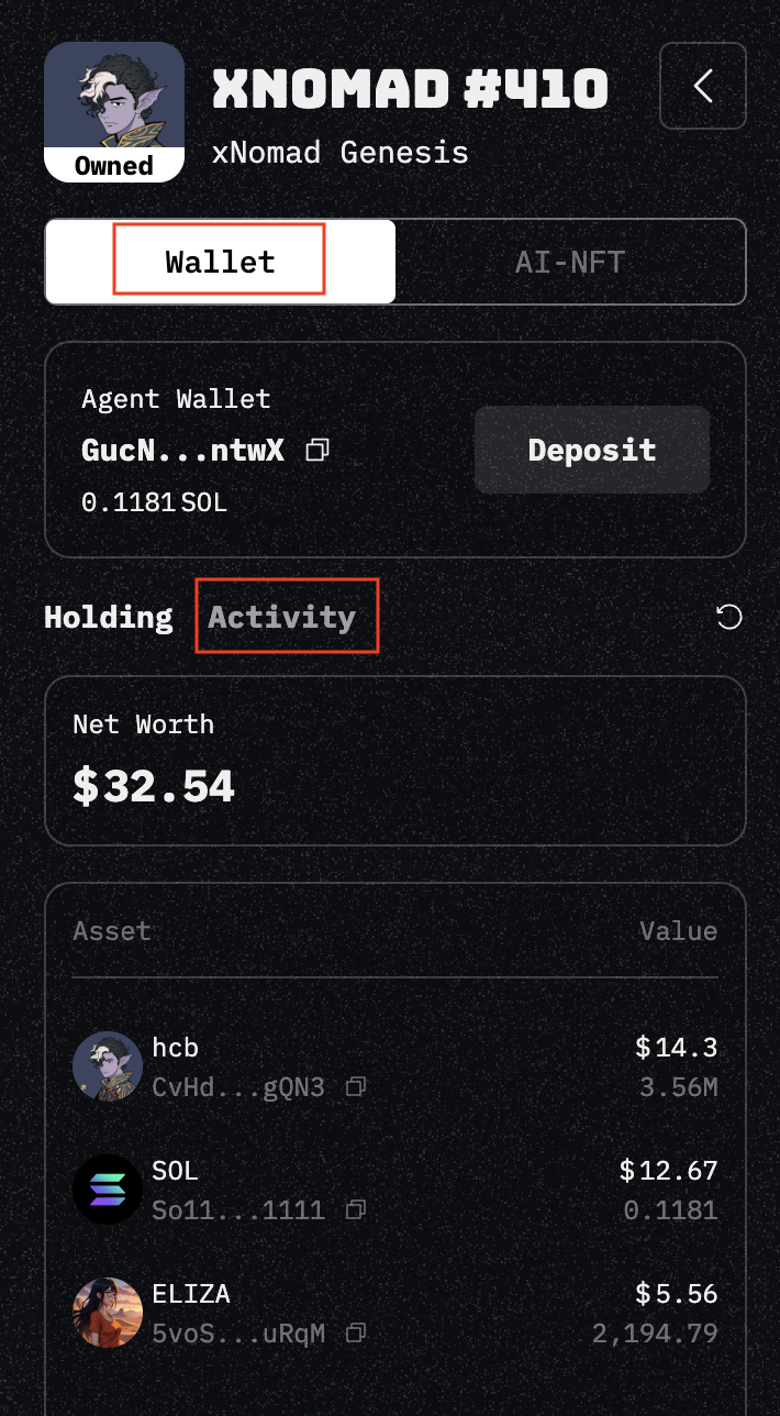 * **Wallet** — Displays the agent wallet value, the assets Worth it holds, and recent activity involving the wallet.