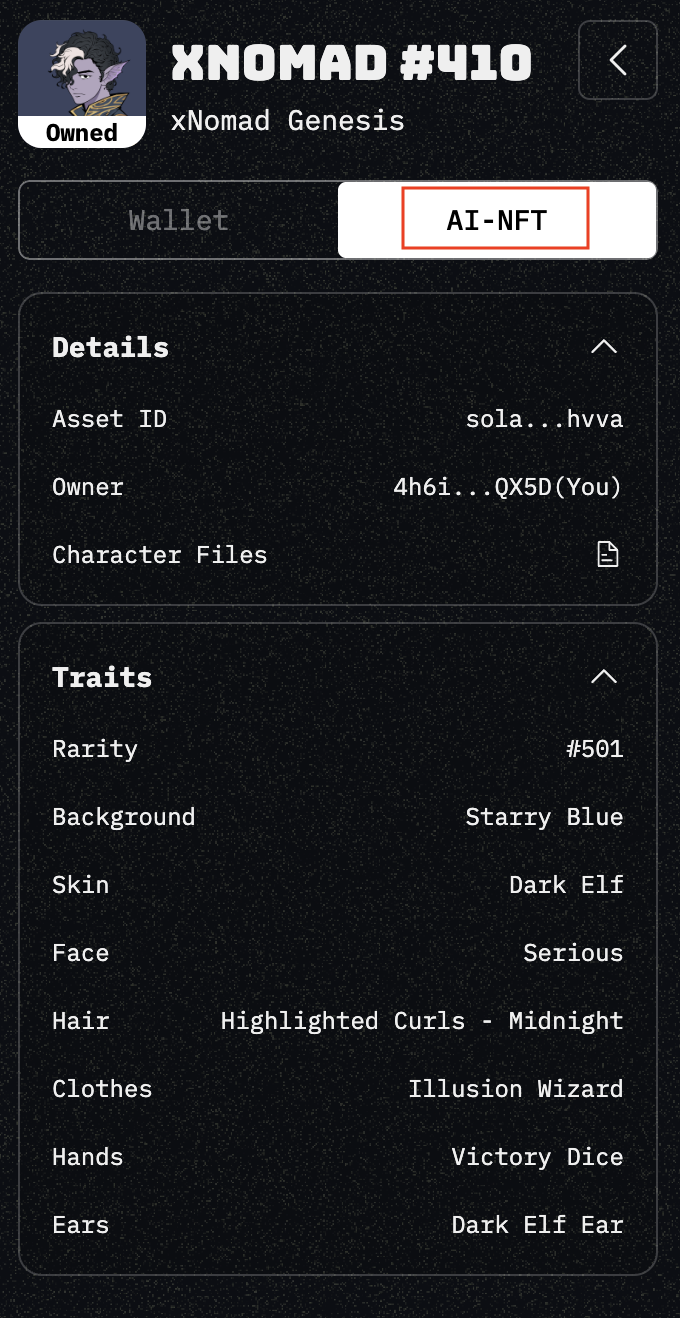 In the AI-NFT tab, it displays the **details and traits** of your AI-NFT, and the character files defined when it was first created.